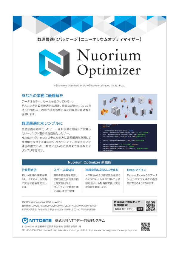 | 数理最適化パッケージ Nuorium Optimizer | 株式会社NTTデータ数理システム | |||