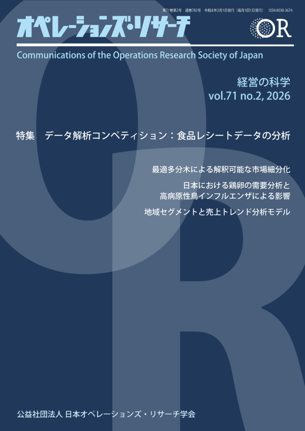 | 事例研究[論文] 最適多分木による解釈可能な市場細分化 | 深谷 悠人,伊熊 大貴,板山 咲穂,上原 祐輝,菊池 明飛,武井 柊悟,竹内 崇貴,柳 智也,鈴木 颯斗,矢中 祥吾,和田 菜々里,池田 春之介,高野 祐一 | 事例研究[論文] | 61 | |